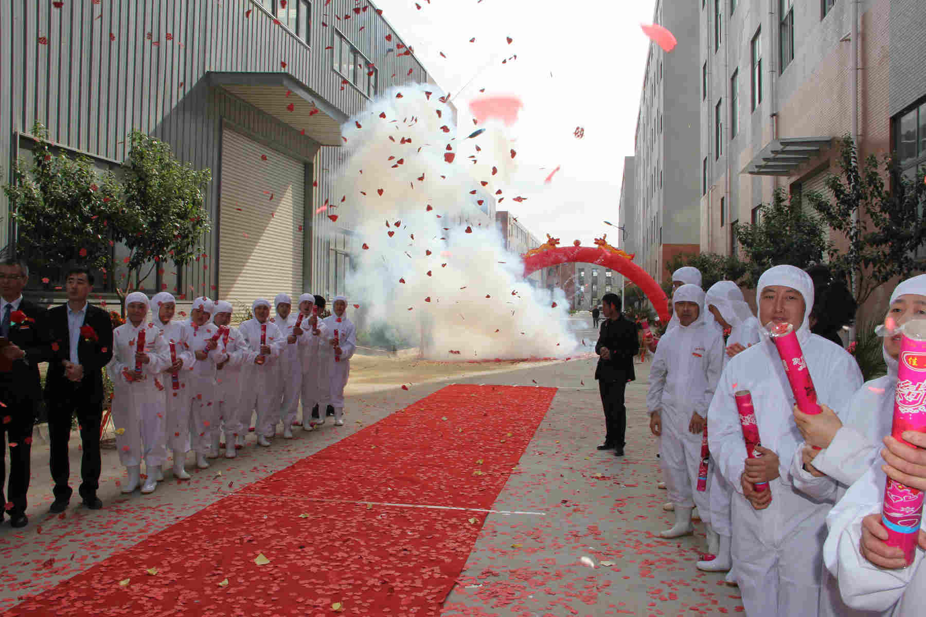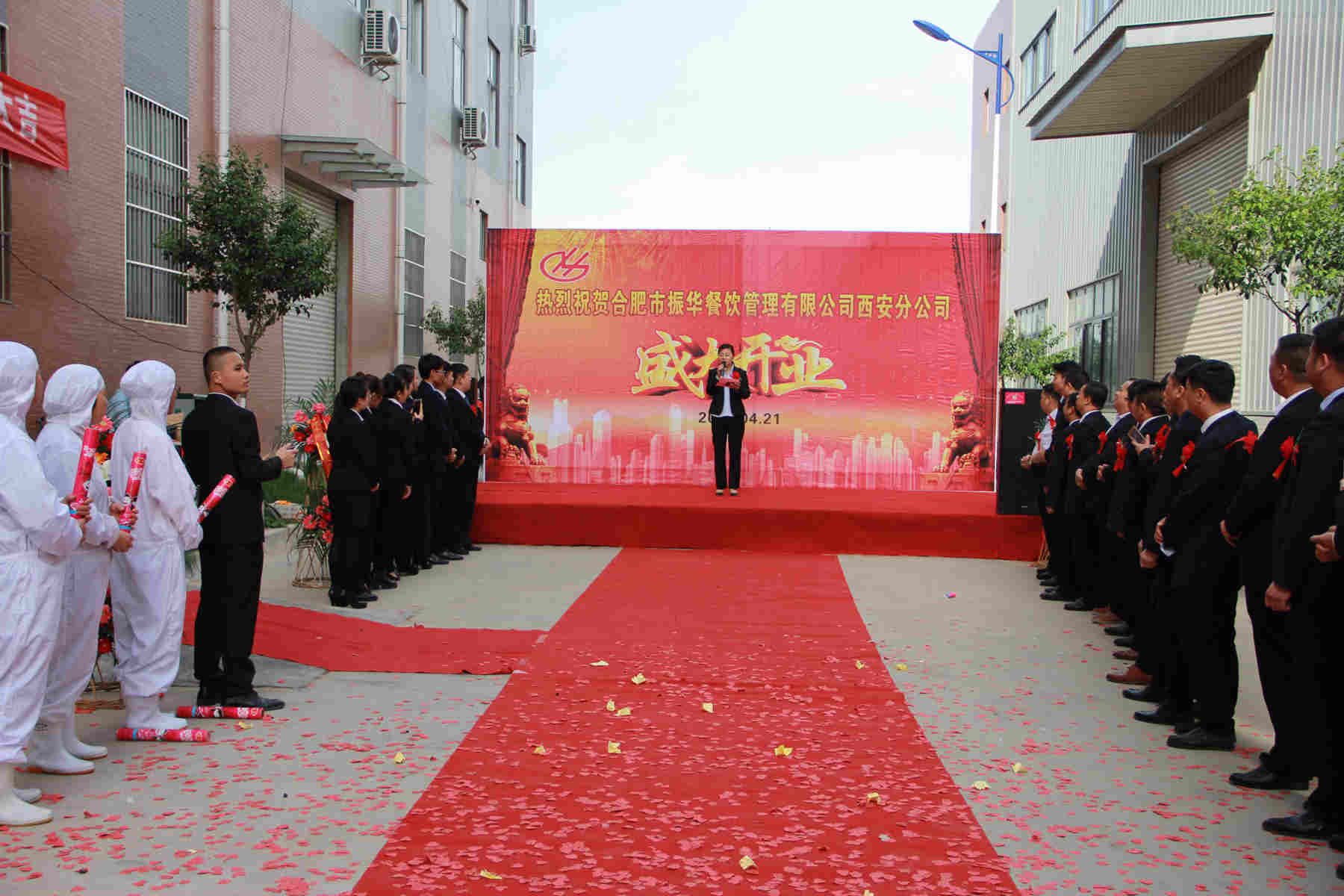 開業(yè)典禮上,首先由振華餐飲董事長張振華上臺致辭;其次由西安分公司經(jīng)理儲繼飛致辭并宣布開業(yè);隨后董事長、董事、各分公司經(jīng)理、西安分公司經(jīng)理及優(yōu)秀員工上臺剪彩;最后與會人員上臺合影留念。