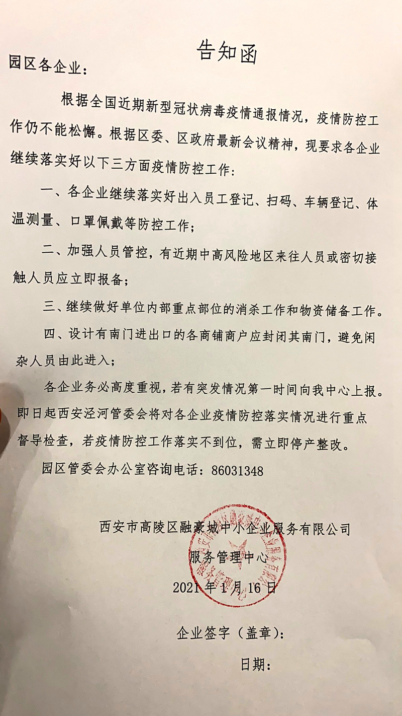 根據(jù)全國(guó)近期新型冠狀病毒疫情通報(bào)情況,疫情防控工作仍不能松懈。結(jié)合區(qū)委、區(qū)政府會(huì)議精神,繼續(xù)落實(shí)疫情防控工作,絲路融豪工業(yè)城立即采取疫情防控措施,保障入園企業(yè)順利生產(chǎn)。