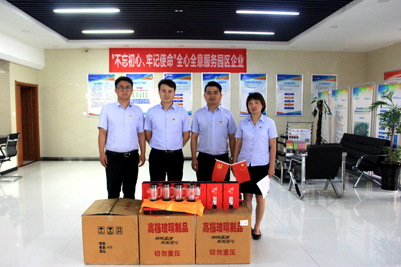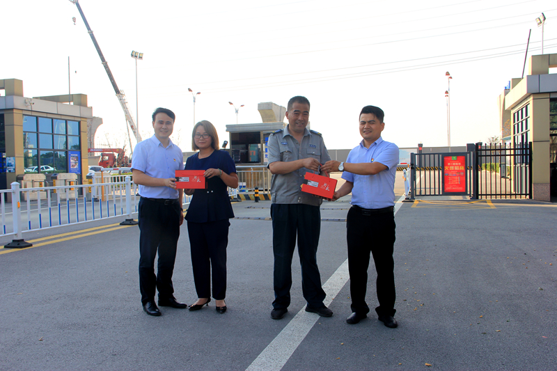 發(fā)放現(xiàn)場(chǎng),公司黨支部副書(shū)記惠洋洋帶領(lǐng)黨員把一個(gè)個(gè)紀(jì)念品送至員工手中。