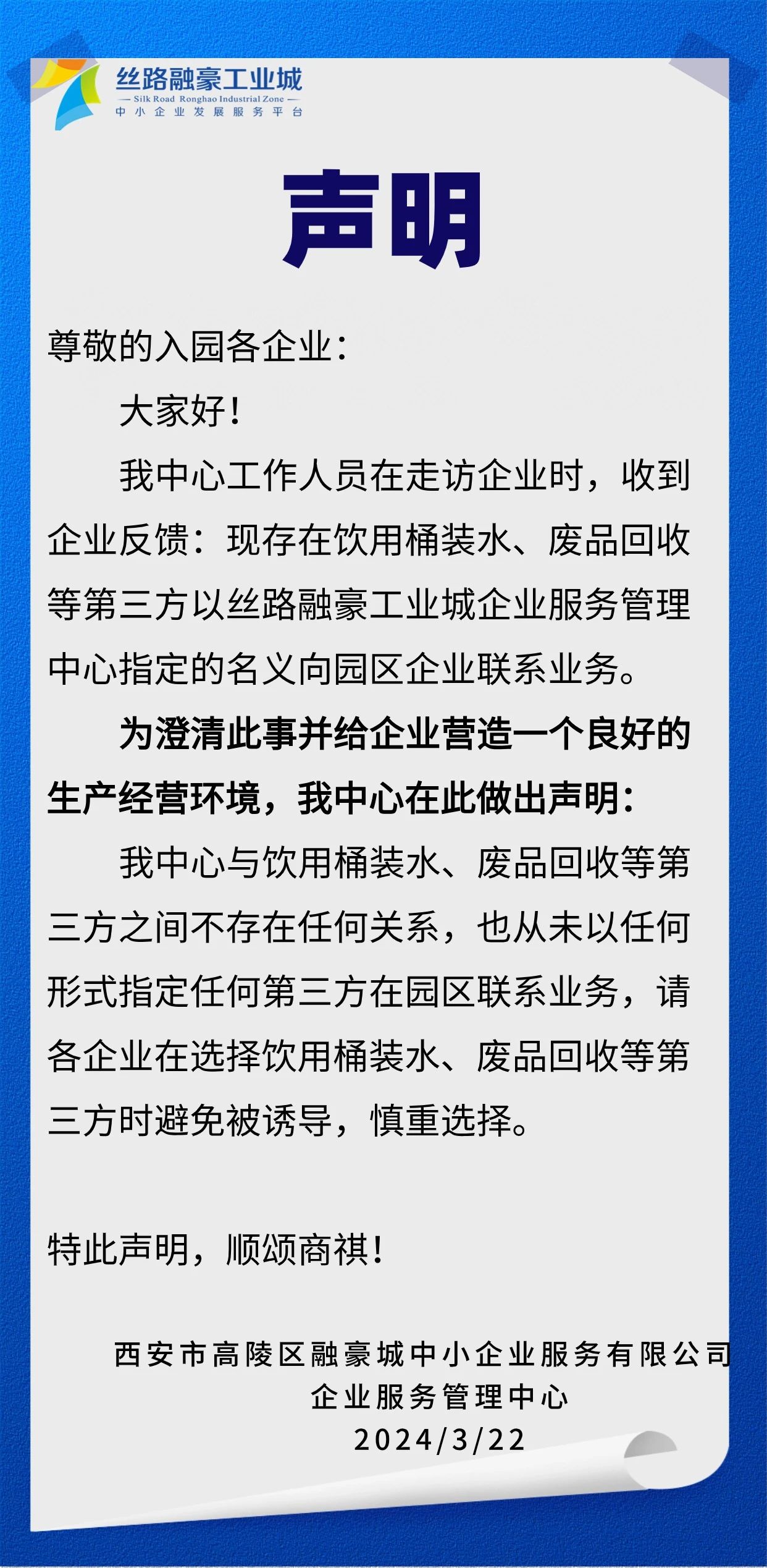 關(guān)于絲路融豪工業(yè)城園區(qū)第三方私自以企業(yè)服務(wù)管理中心名義聯(lián)系業(yè)務(wù)聲明!