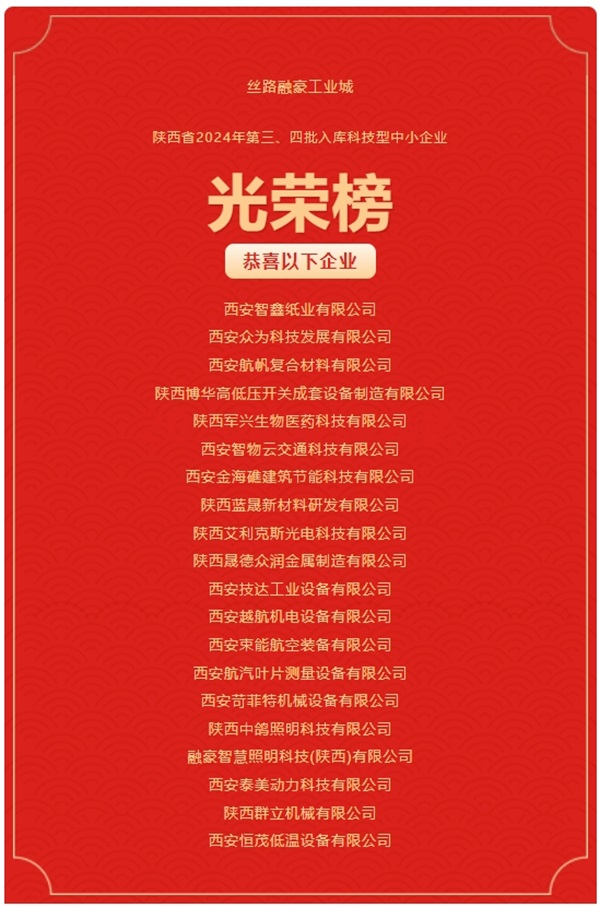 9月20日,陜西省工業(yè)和信息化廳發(fā)布了陜西省2024年第三、四批入庫科技型中小企業(yè)名錄,絲路融豪工業(yè)城新增20家入庫企業(yè)。園區(qū)僅2024年以來,就已經(jīng)有45家企業(yè)被列入陜西省科技型中小企業(yè)名錄庫。園區(qū)科創(chuàng)成果再創(chuàng)佳績,科技型企業(yè)等優(yōu)質(zhì)企業(yè)數(shù)量不斷攀升,也是園區(qū)產(chǎn)業(yè)招引孵化實力的有力印證。