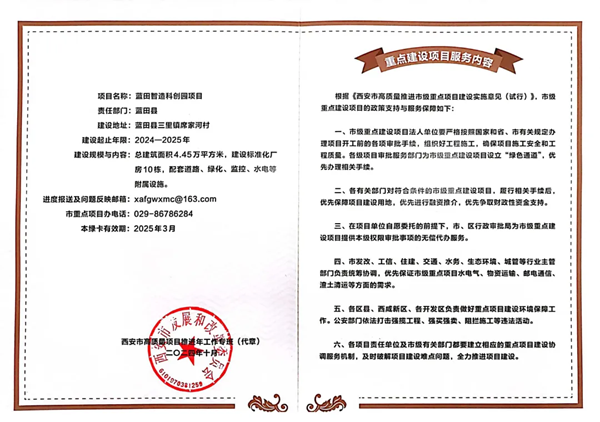 市級重點項目是西安市經(jīng)濟高質量發(fā)展的關鍵支撐,“綠卡”則為其提供了全方位保障。西安市重點建設項目“綠卡”由西安市發(fā)展和改革委員會、市重點建設項目領導小組辦公室聯(lián)合頒發(fā)。持有“綠卡”,藍田智造科創(chuàng)園項目將在建設手續(xù)辦理、建設資金爭取、審批事項、工程建設、環(huán)境保障、協(xié)調服務等環(huán)節(jié)均享有優(yōu)先和政策支持。